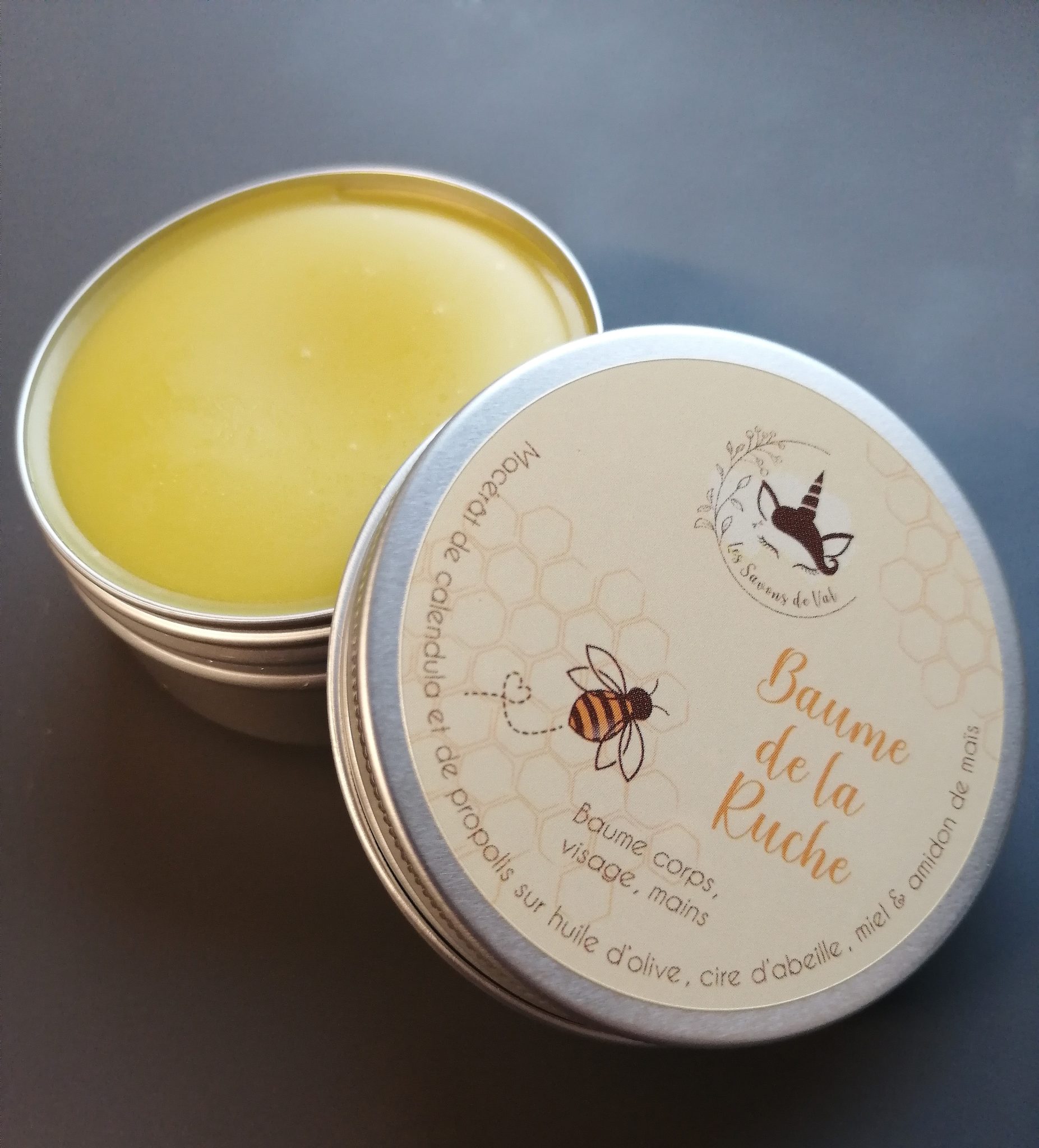 Macérât de calendula et de propolis sur huile d’olive, cire d’abeille, miel et amidon de maïs.